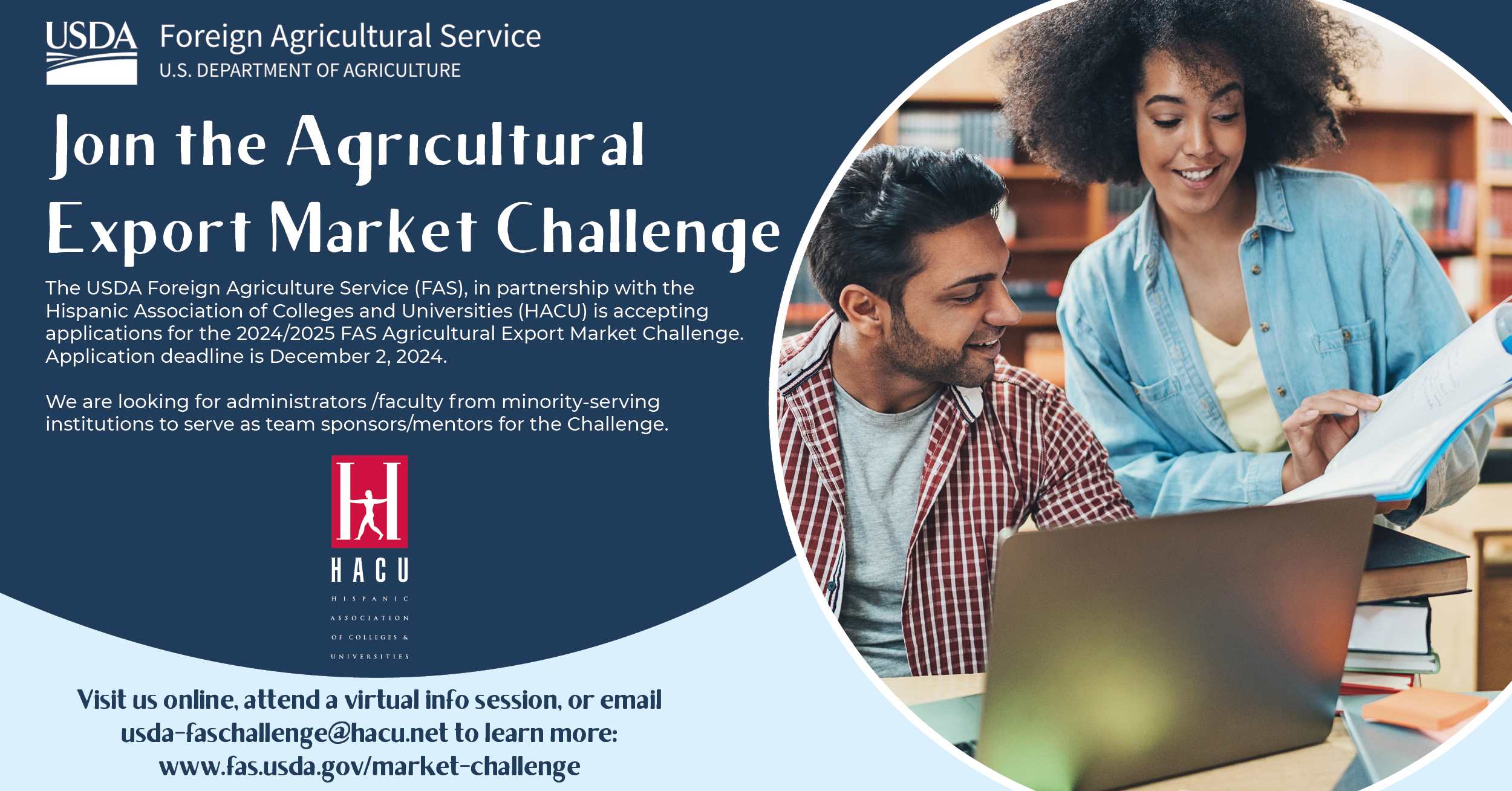 The Hispanic Association of Colleges and Universities and the United States Department of Agriculture Foreign Agriculture Service have announced that applications are now being accepted for the 2024/2025 FAS Agricultural Export Market Challenge. This experiential learning opportunity is available for administrators/faculty from minority-serving institutions to serve as the team sponsor/mentor to a team of junior and senior year undergraduate students from their institution for the Challenge.