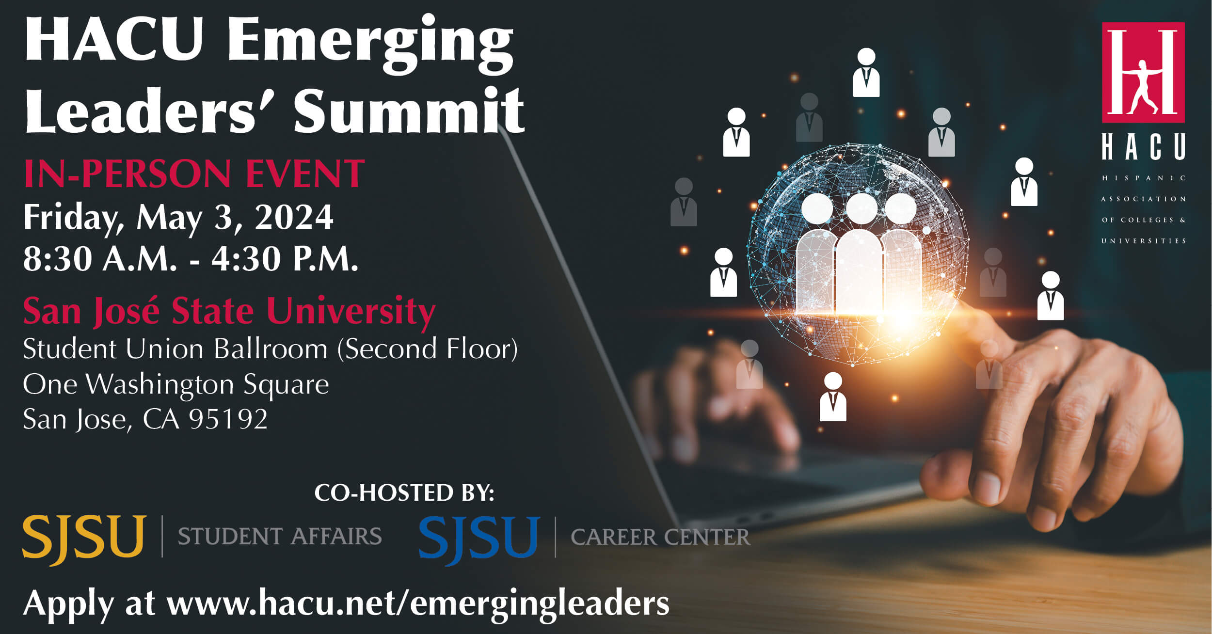The Hispanic Association of Colleges and Universities is accepting applications from undergraduate and graduate students to participate in an in-person Emerging Leaders’ Summit on May 3, 2024, from 8:30 a.m. – 4:30 p.m. The event is being presented in partnership with San José State University. Students enrolled at HACU-member institutions in the California Bay area are encouraged to apply.