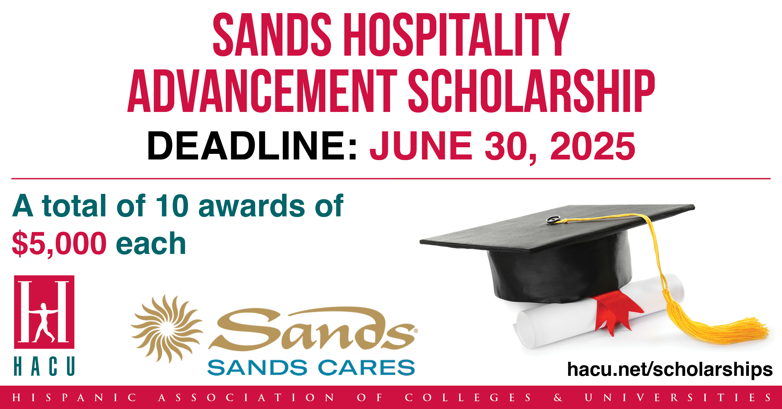 The Hispanic Association of Colleges and Universities has partnered with Las Vegas Sands to offer 10 Sands Hospitality Advancement Scholarships in the amount of $5,000 each to college students enrolled at the following HACU-member institutions:
