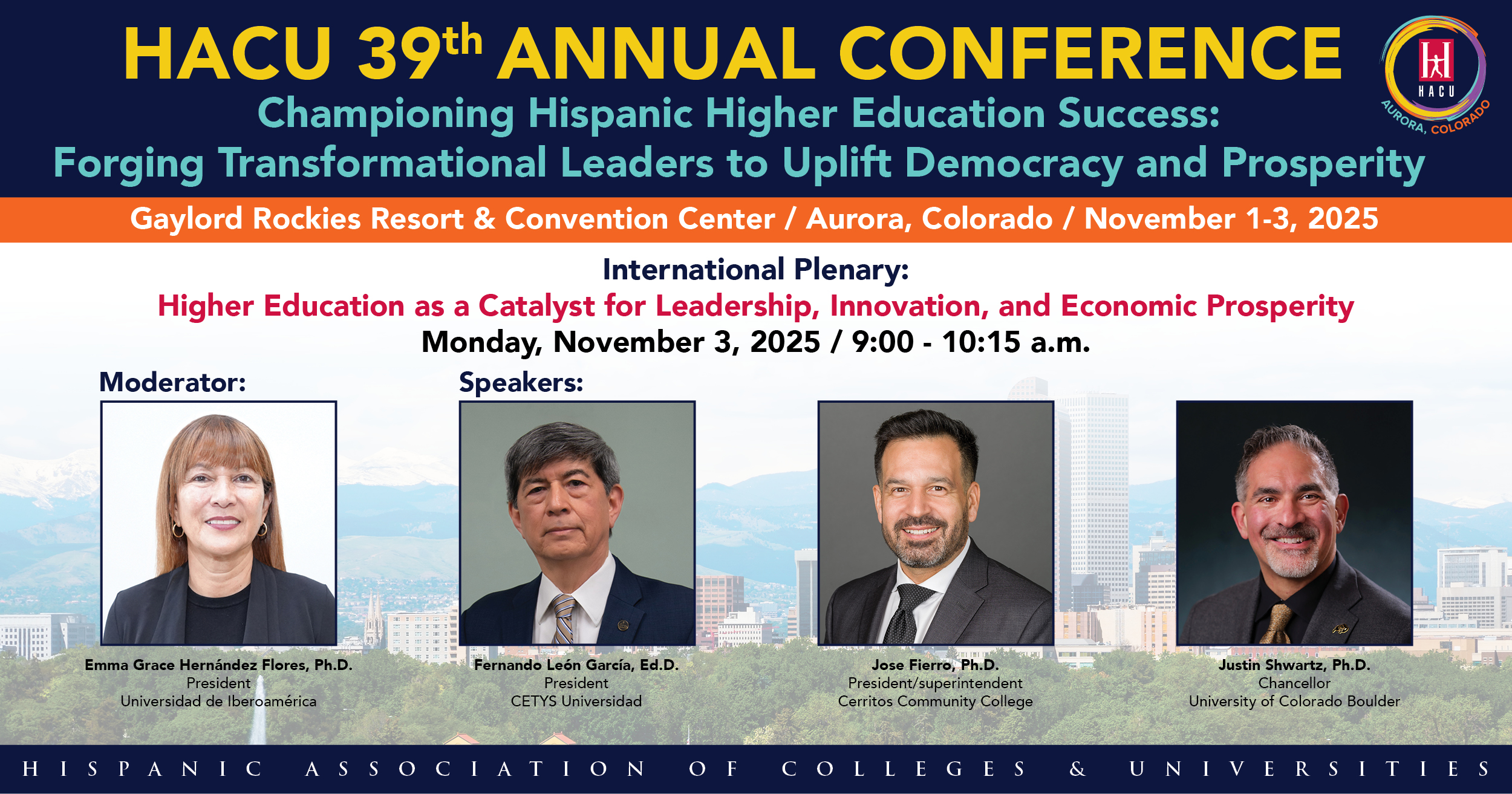 The Hispanic Association of Colleges and Universities has announced the speakers for the International Plenary of its 39th Annual Conference “Championing Hispanic Higher Education Success: Forging Transformational Leaders to Uplift Democracy and Prosperity,” taking place on Nov. 3, 2025, at the Gaylord Rockies Resort and Convention Center in Aurora, Colorado.