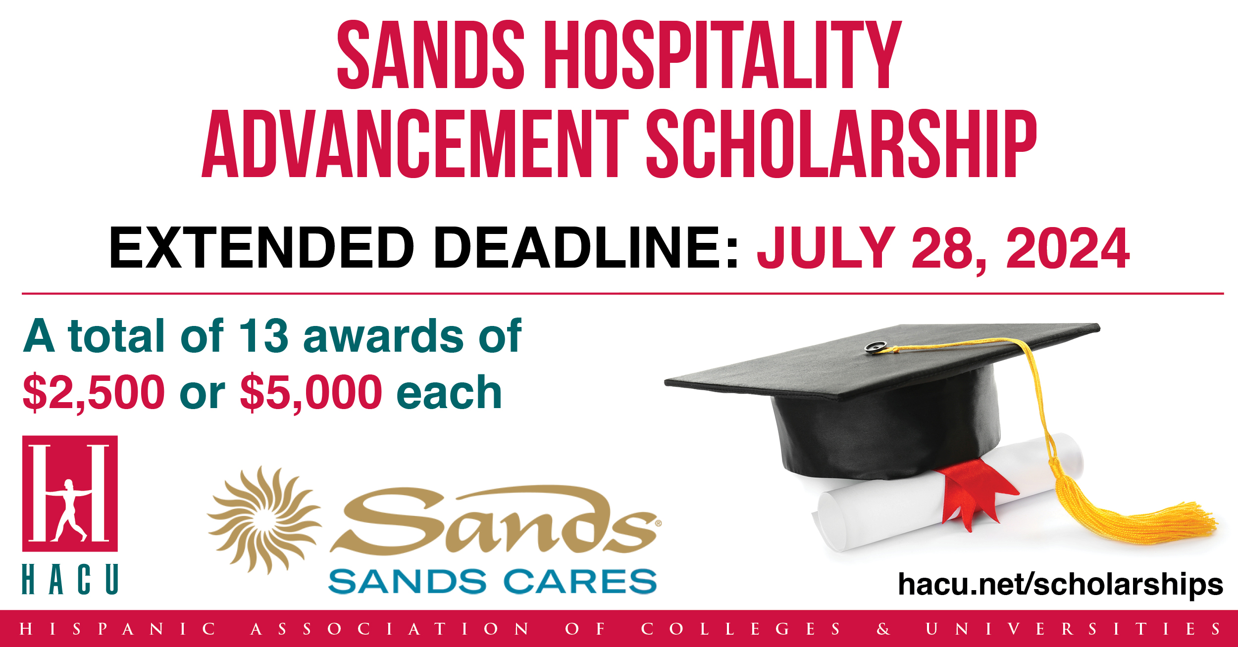 The Hispanic Association of Colleges and Universities has partnered with Las Vegas Sands to offer thirteen Sands Hospitality Advancement Scholarships in the amount of $2,500 or $5,000 to college students enrolled at HACU-member institutions in these designated areas: