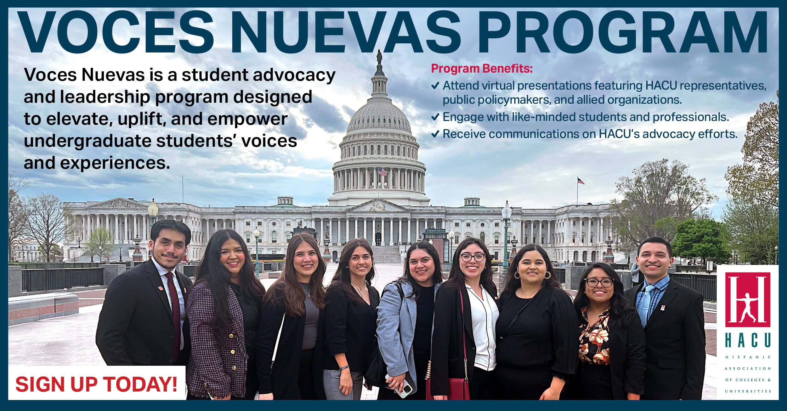 The Hispanic Association of Colleges and Universities is offering college students from HACU-member institutions the opportunity to join the Voces Nuevas Program, focused on student engagement in advocacy and leadership experiences.