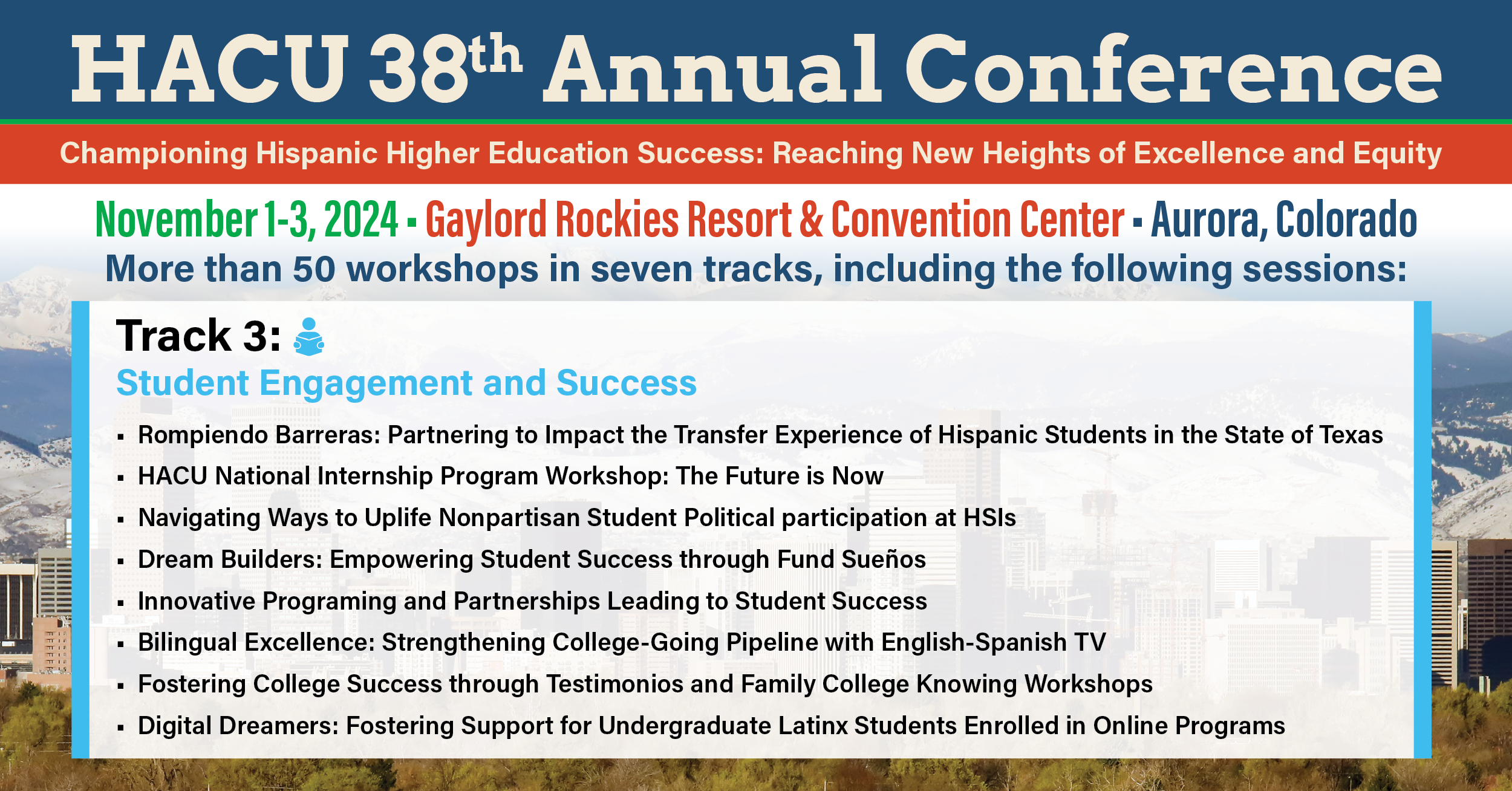 The Hispanic Association of Colleges and Universities has announced its 38th Annual Conference will feature topics in “Student Engagement and Success,” under track three. More than 50 workshops that address the theme, “Championing Hispanic Higher Education Success: Reaching New Heights of Excellence and Equity,” will be offered in seven tracks. The Conference will be held at the Gaylord Rockies Resort & Convention Center, Nov. 1-3, 2024, in conjunction with pre-conference events.