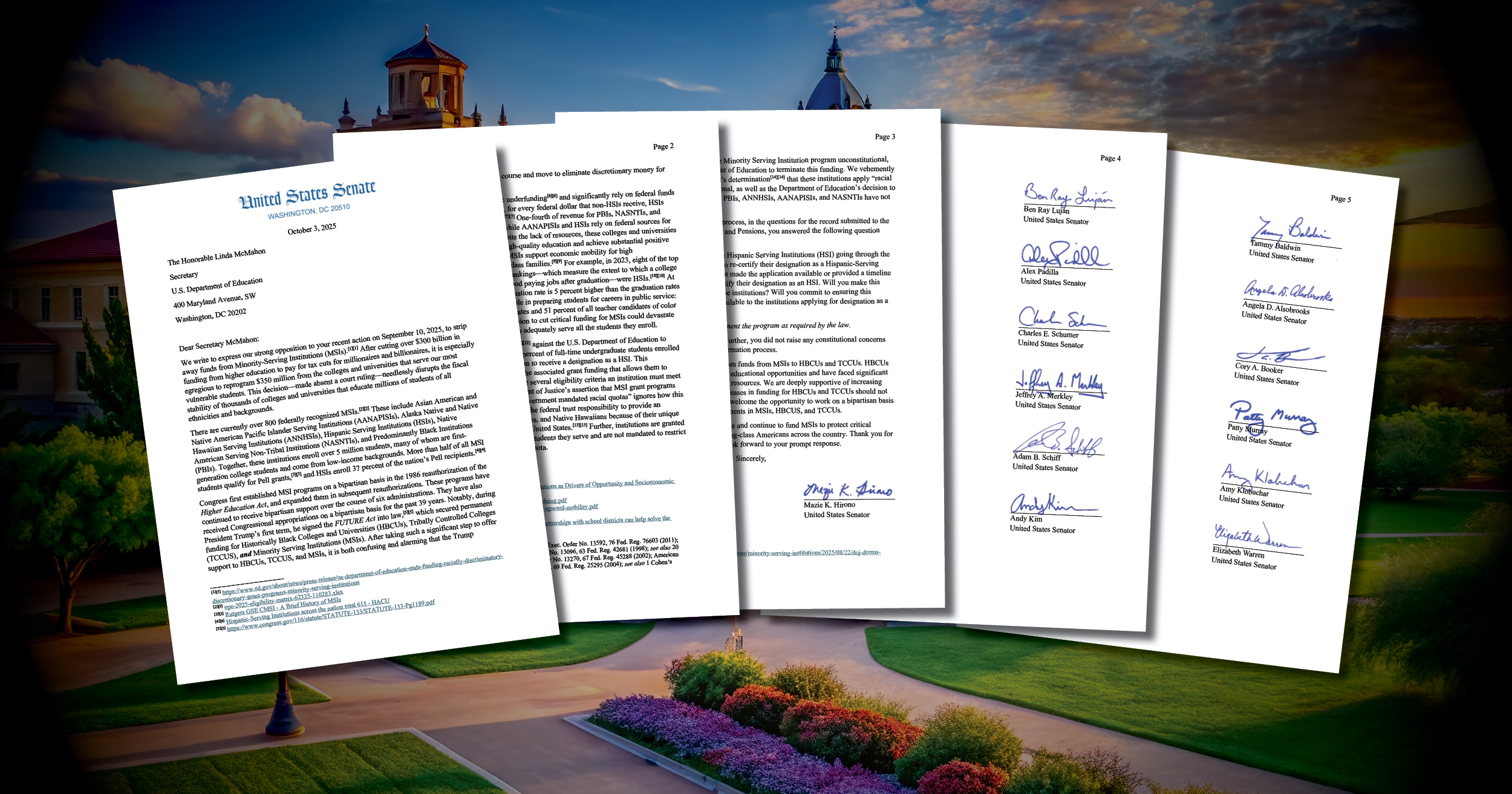 Members of the Senate HELP Committee signed a letter to U.S. Department of Education expressing opposition to recent actions stripping away funds from Minority-Serving Institutions (MSIs). The letter noted the decision was made absent a court ruling, and “needlessly disrupts the fiscal stability of thousands of colleges and universities that educate millions of students of all ethnicities and backgrounds.”