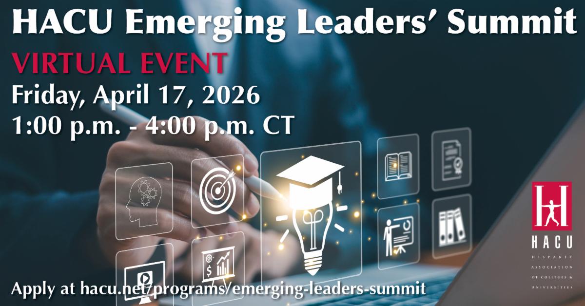 HACU will host a virtual Emerging Leaders’ Summit for college students on April 17, 2026, from 1:00 – 4:00 p.m. CT. Undergraduate and graduate students of all majors who are enrolled at a HACU-member institution can sign up to attend. More>>